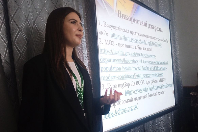 У межах конференції Бойко Інна, студентка 432 групи ОПП «Сестринська справа», представила дослідження на тему «Збереження психічного здоров’я та формування навичок допомоги іншим у здобувачів освіти Чортківського медичного фахового коледжу в умовах воєнного часу», виконане під науковим керівництвом Жабіцької Ольги Богданівни – викладача неврології та психіатрії.